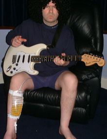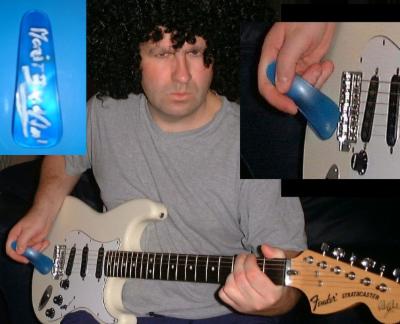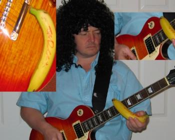On the eve of Adelangst's In-Continent Tour 2005 Jim Brodie announced his full endorsement of the revolutionary carbon fibre banana shaped guitar slide. Said to increase reverberations 10 fold on certain models of guitar, this wonderful yellow guitar slide has also been given the defining signatory treatment by Jim Brodie, as each of the guitar slides is carefully engraved using an Extra Fine Water Resistant Non Xyene and non-porous permanent signature. Of the new slide Jim says "It is a hefty, no-compromise tool that features unsurpassed tone and control. It can be easily put between the teeth within around 2 seconds when not in use. Although this makes you look a bit like a clown with a huge smile, it then leaves all the fingers free for unencumbered, conventional playing. It works so well because of the unique carbon fibre design: the initial small probe section section remains in place using a small finger strap, and the main yellow "shaft" section can be easily rotated using the thumb. The move is done with one hand, so quickly that it doesn't interrupt a solo, although you have to be a jolly good player to master this technique."