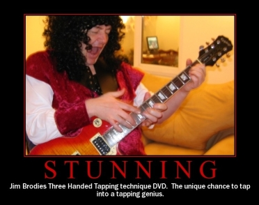 This DVD contains everything you need to become a tapping ninja turtle. From two string scale and arpeggio ideas to full blown multi handed taps blazing across the fretboard. This lesson will add speed, accuracy, and spunk to your ejaculations. The DVD includes a 1 minute guitar track played by Jim Brodie, the world famous guitarist from Adelangst. The rest of the DVD shows Stuart Bollocks.