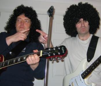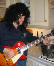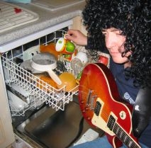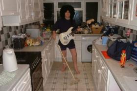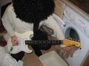 Jim and Moritz here display their adeptness at retaining a God Of Guitar demeanour whilst performing standard household chores.  Jim: "Cooking is easy with one hand on the saucepan and one practicing picking techniques with the guitar.  Conversely with the dishwasher you can play with the left hand if you crank up the volume a bit and perform some hammer on and hammer off manoeuvres."  Moritz continues "loading the washing machine is always one of my favourites, especially if one of Candy's Knickers gets caught up in my machine head, it all gets a bit Tom Jones.  If some washing does land on the guitar it acts as a dampener and can actually be interesting  depending upon the type of material used.