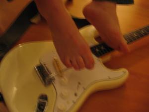 |  | First off then, "Heel and Toe". Place your foot along the guitar and then waggle your foot so that the heel and then toe produce effects and notes.  Then you can move your foot up and down changing the two notes as you go.  It will sound at times like a fire engine, but it’s a good technique when learned.